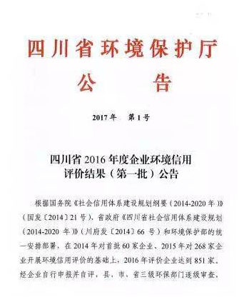 7月21日,四川省環境保護廳發布2017年第1號公告,公布了2016年度第一批企業環境信用評價結果。在全省申報的851家企業中,包括四川東材科技集團股份有限公司在內的29家企業獲得四川省2016年度“環境誠信企業”稱號。